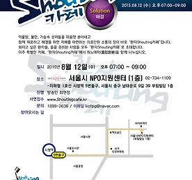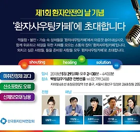 환자Shouting카페 썸네일형 리스트형 제1회 환자안전의 날 기념 '환자샤우팅카페'에 초대합니다 일시 : 2018년 5월 29일 화요일 오후 2시 30분~4시 30분 장소 : 백범김구기념관 컨벤션홀 더보기 제18회 환자샤우팅카페에 초대합니다 제19회 환자샤우팅카페에 초대합니다~ 일시 : 2016년 6월 22일 수요일 저녁 7시 40분~ 9시 장소 : 서울시NPO지원센터 1층 더보기 제17회 환자샤우팅카페에 초대합니다. 더보기 제 16회 환자샤우팅카페에 초대합니다. 더보기 제 15회 환자샤우팅카페에 여러분을 초대합니다 제 15회 환자샤우팅카페에 여러분을 초대합니다! 2015년 5월 11일 월요일 오후 7시 스페이스 노아 커넥트홀 더보기 이전 1 2 3 4 다음